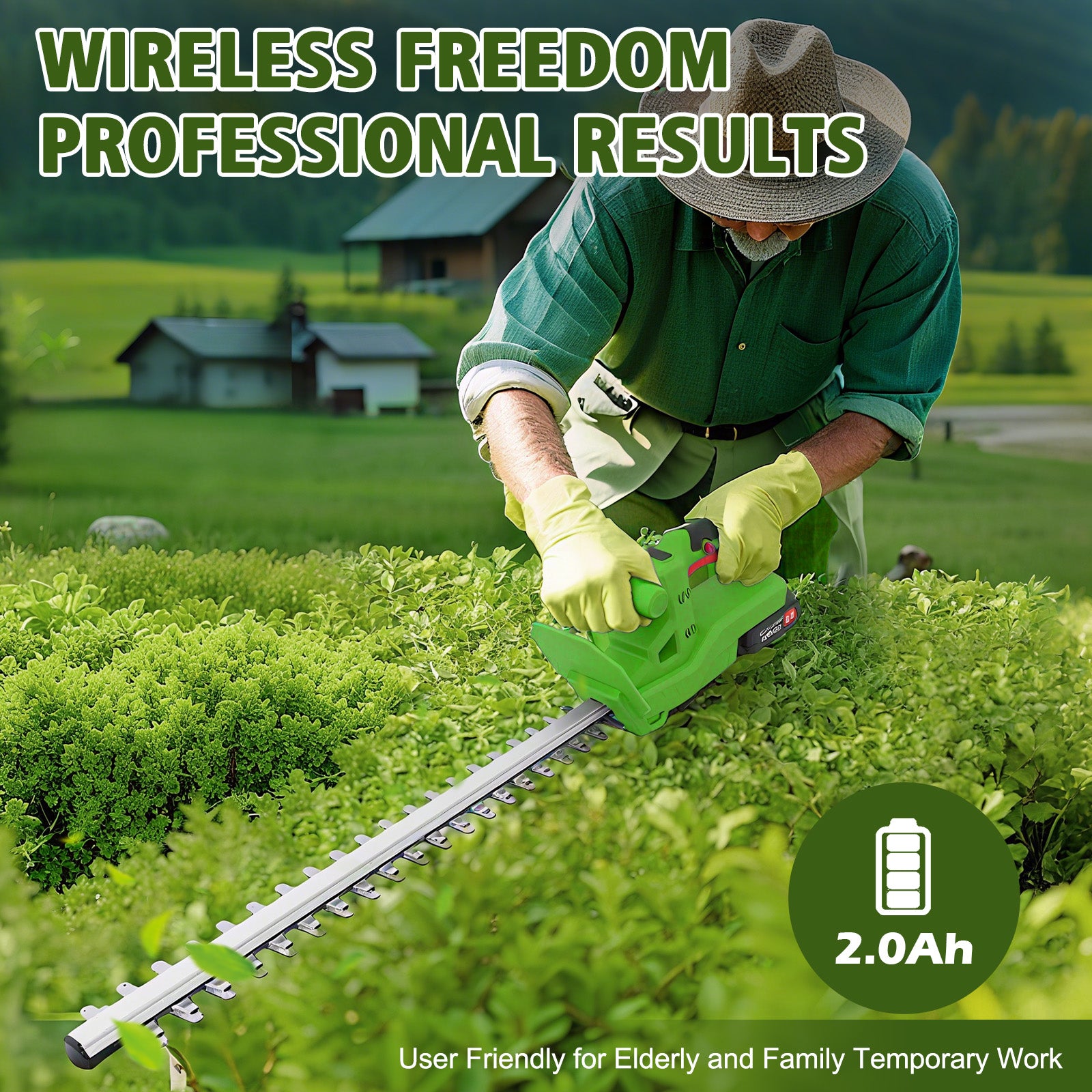 Powered by a 2000mAh high-capacity lithium-ion battery, this hedge trimmer delivers strong and lasting performance, allowing you to complete large trimming tasks without frequent recharging.The included 24V fast charger ensures efficient charging for uninterrupted gardening work. Say goodbye to tangled cords and enjoy truly wireless freedom.