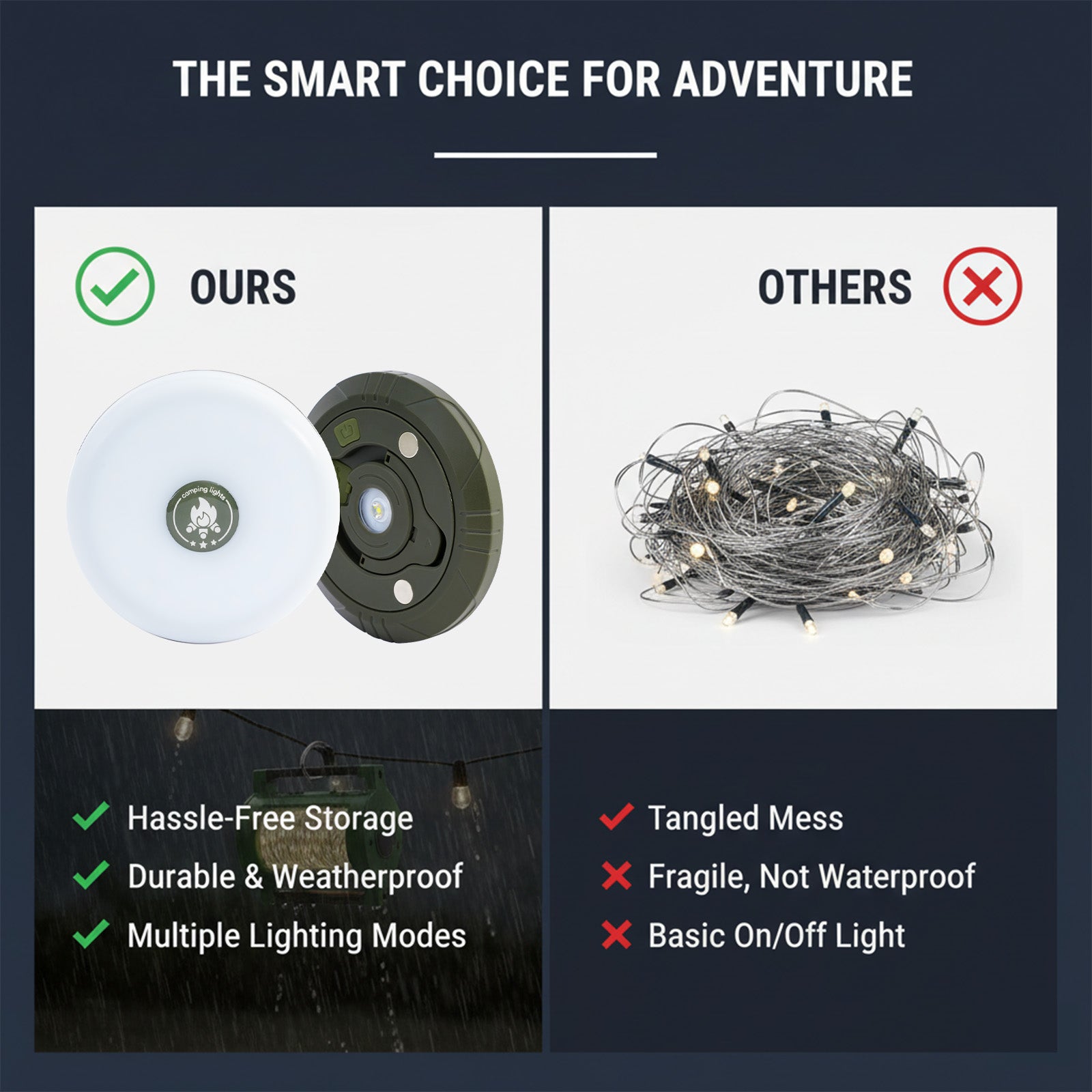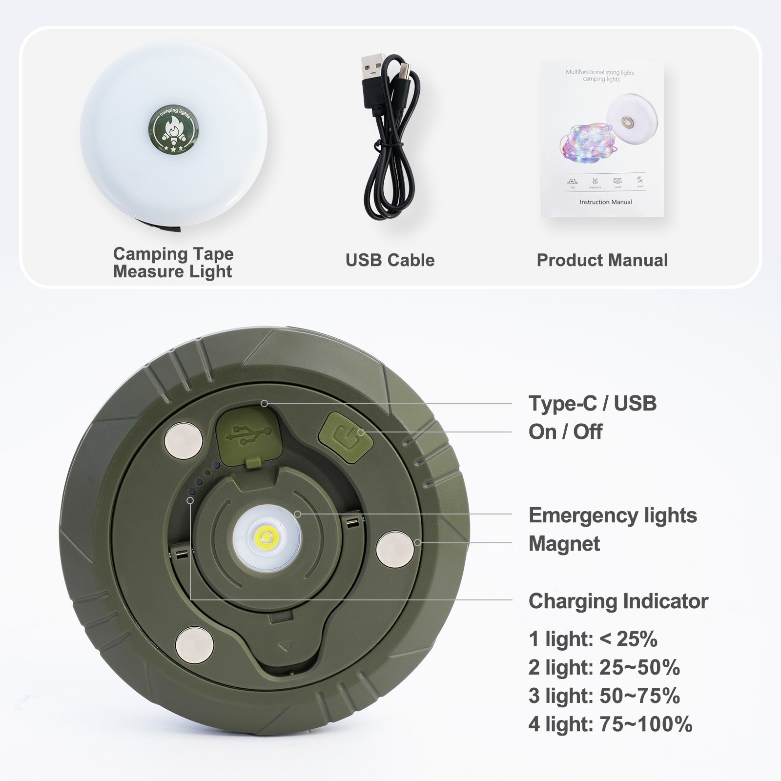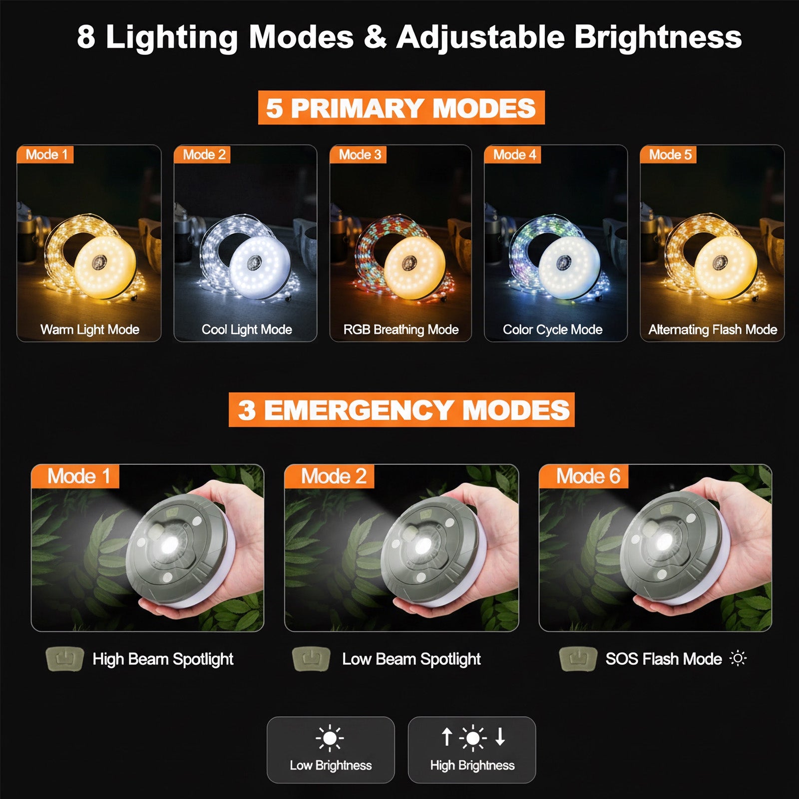 These camping tape measure lights bring an unprecedented lighting experience to your outdoor adventures. The 32.8 ft soft glow string lights gently wrap around the edges of your tent, creating a cozy haven. With five lighting modes ranging from steady to dynamic, and two adjustable brightness levels, you can satisfy all your lighting desires. Its lightweight and portable design ensures easy carrying, whether used as a handheld light or hanging decoration. The unique tape measure storage system allows for quick organization, saving space. Waterproof and durable, it withstands natural challenges. With a built-in high-capacity battery, it offers long-lasting performance, accompanying you through every camping night. Whether for exploration or celebration, this is an ideal choice, filling every outdoor gathering with warmth and surprise.