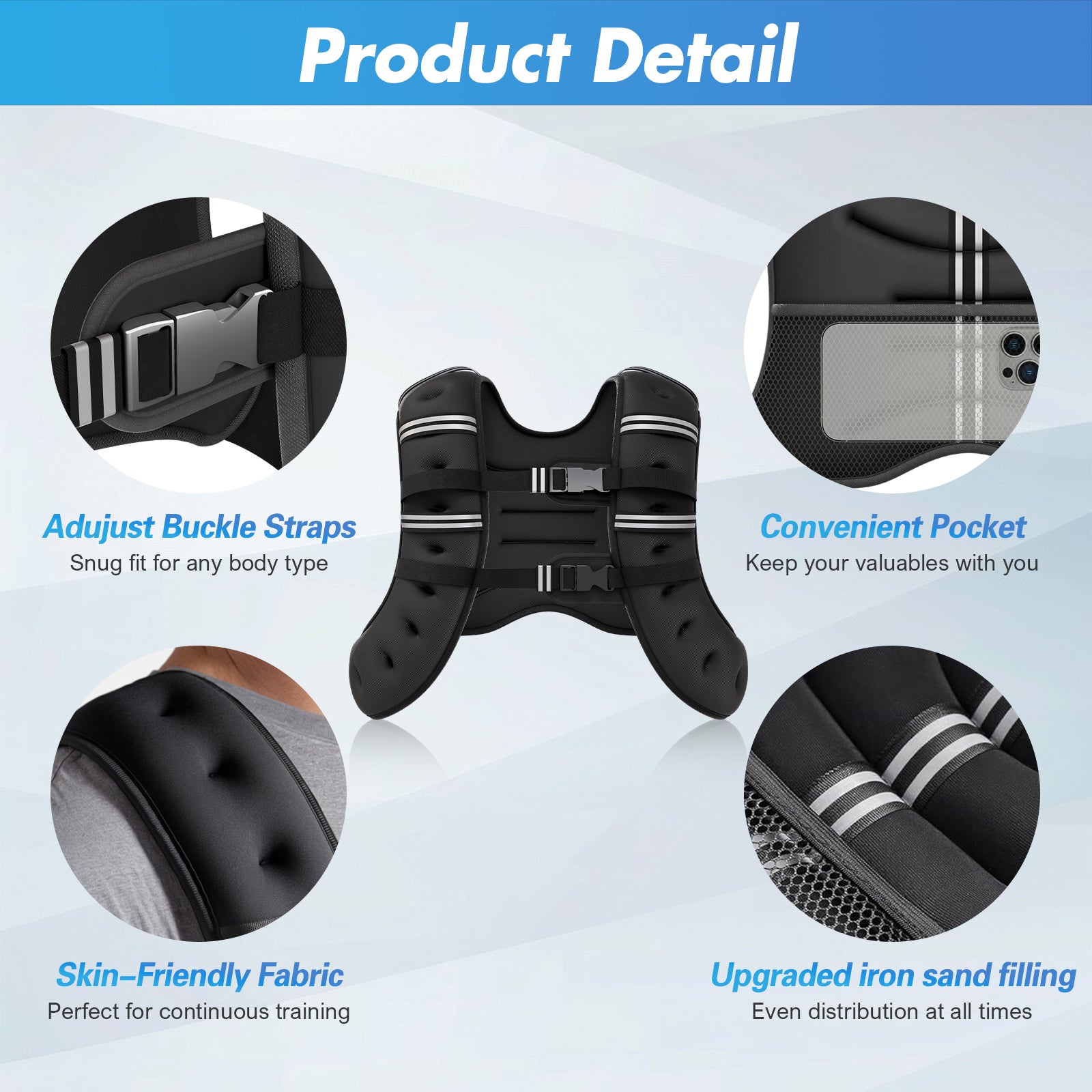 Weighted Vest made of durable SBR material filled with iron sand. Strong double-stitched seams for lasting use. Reflective strips for safe night runs. Back storage pocket for phone and keys. Thick shoulder straps and breathable fabric for comfort. Adjustable buckle for secure fit. Use Weighted Vest to build muscle, increase endurance, and improve running.