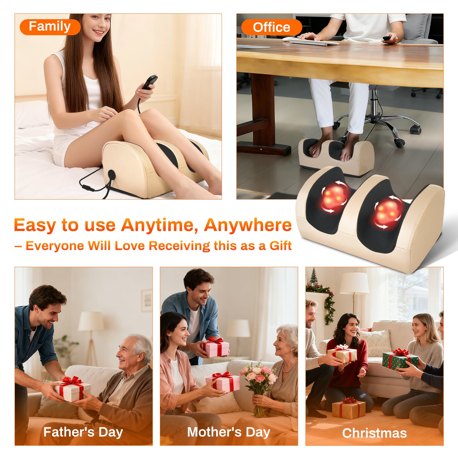 This leg massager brings professional relief by combining shiatsu techniques with soothing heat. It works like real hands to target your soles and calves, helping to ease foot pain, muscle tightness, and discomfort.Choose from three massage modes and adjust the strength to fit your needs. The shiatsu foot massager is lightweight and works as a powerful calf massage machine, perfect for home, office, or travel.Ideal for recovery, daily relaxation, or as a thoughtful gift, this foot massager offers a warm, comforting experience for everyone.