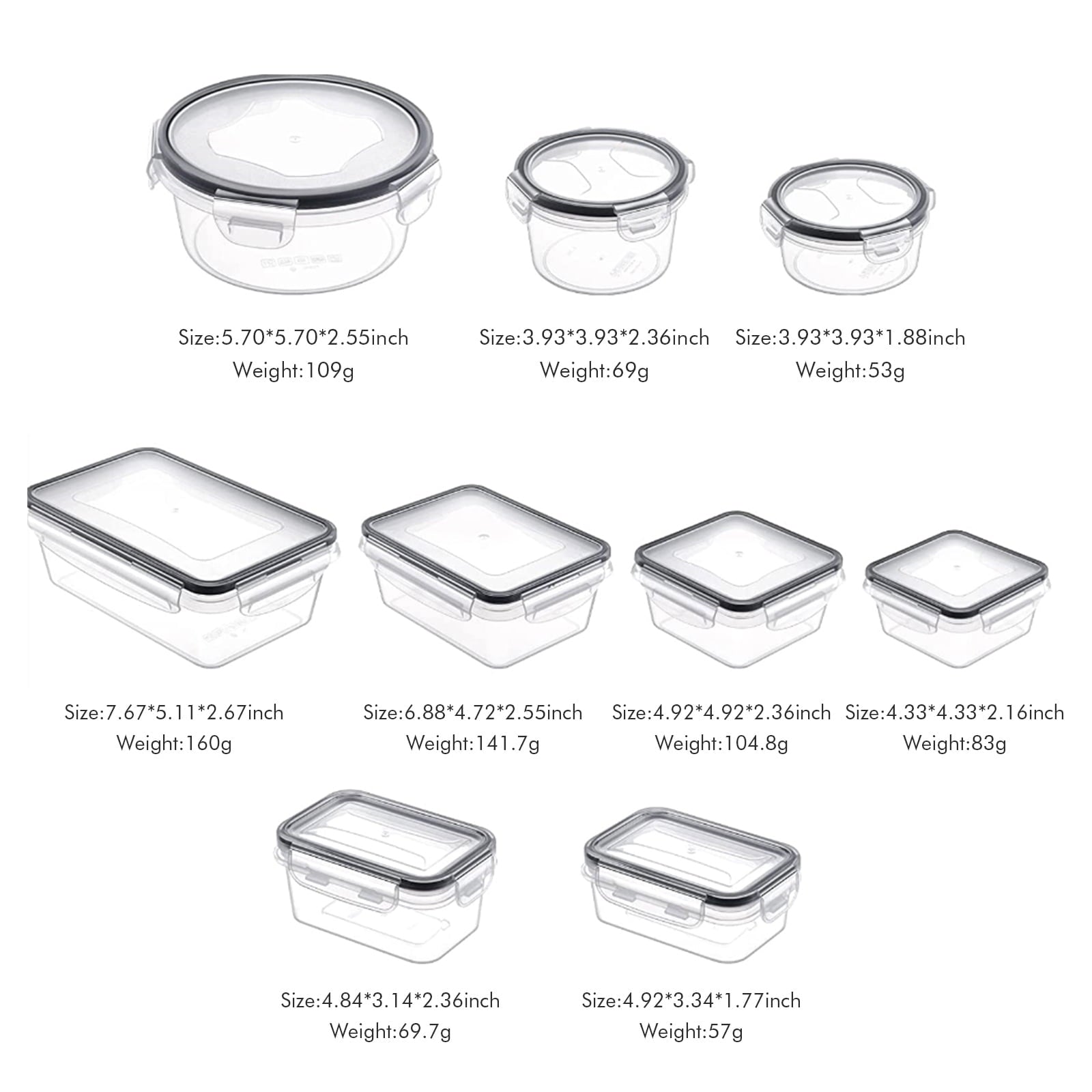 Comes in a set of 48 clear plastic containers with 24 lids, including 5 rectangle containers(2*33.8 oz, 1*28.4 oz, 1*10.8 oz, 1*8.1 oz), 4 square containers (1*18.6 oz, 3*11.8 oz),4 round containers (1*23.7 oz, 1*10.1 oz, 1*8.1 oz )with 8 round sauce boxes wich are 1.2 oz. Boxes of different sizes can hold various types of food to meet different kitchen storage needs.