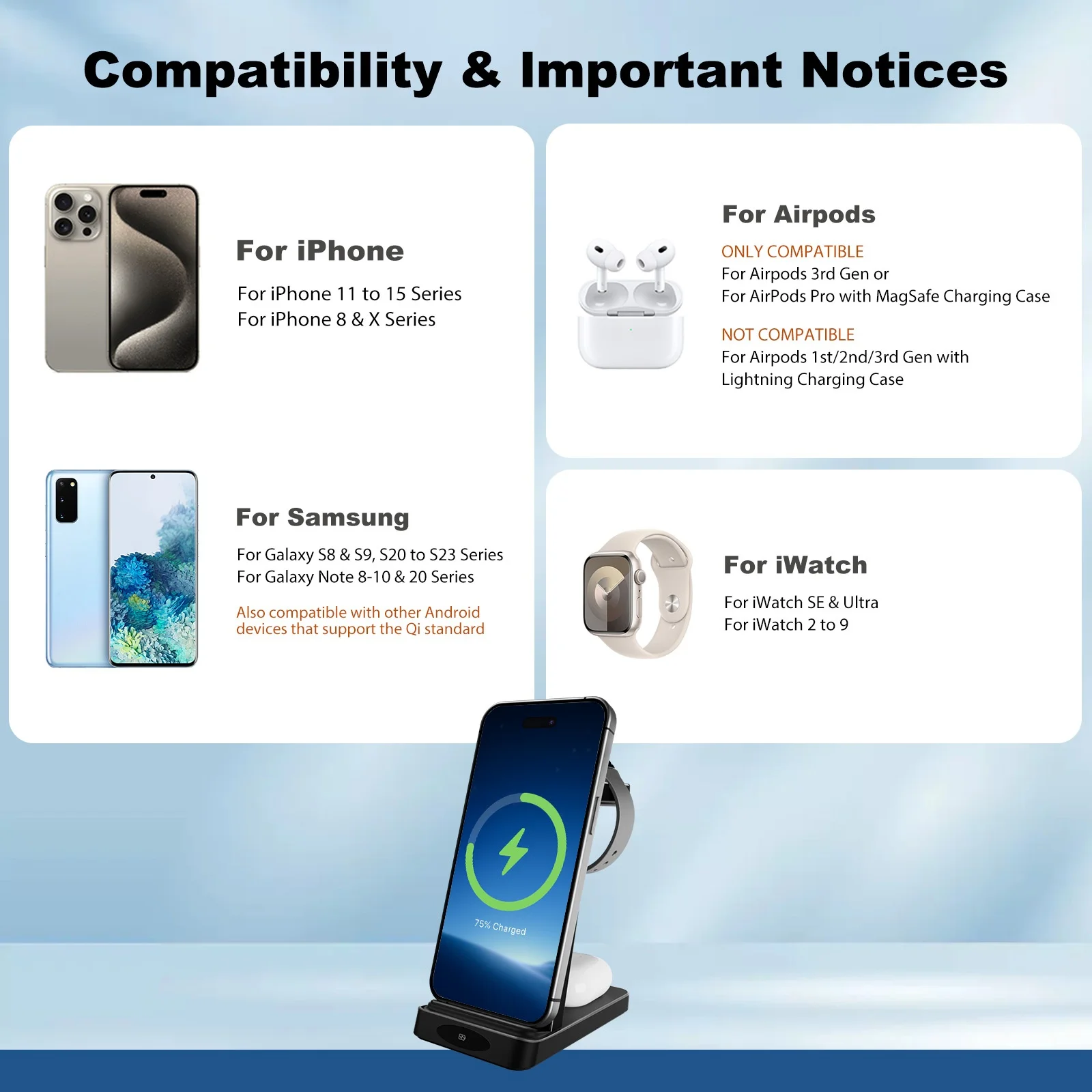 Compatible Models: For iphone 16 15 14 13 12 11 8 Plus Pro Max Xs, For Airpods 3rd Gen, For iWatch 9/8/Ultra 2 SE/7/6/5/4/3/2, For Samsung Galaxy S24 S23 S22 S21 Ultra Series