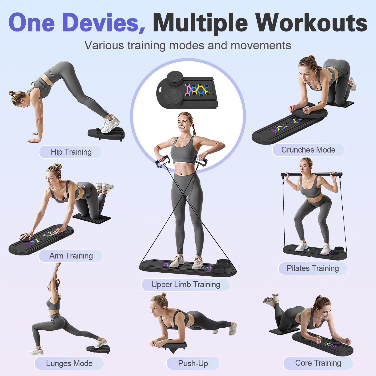 Want a machine that can work out your entire body? This pilates reformer set combines multiple exercise functions into one, including an ab roller, resistance bands, push-up handles, a balance board, and a dynamic plank, providing efficient core training, body sculpting, and flexibility improvement for users of all levels. This foldable pilates board offers over 15 exercise modes, breaking away from traditional single-function training, allowing you to easily switch between muscle strengthening, fat burning, and flexibility improvement training modes.