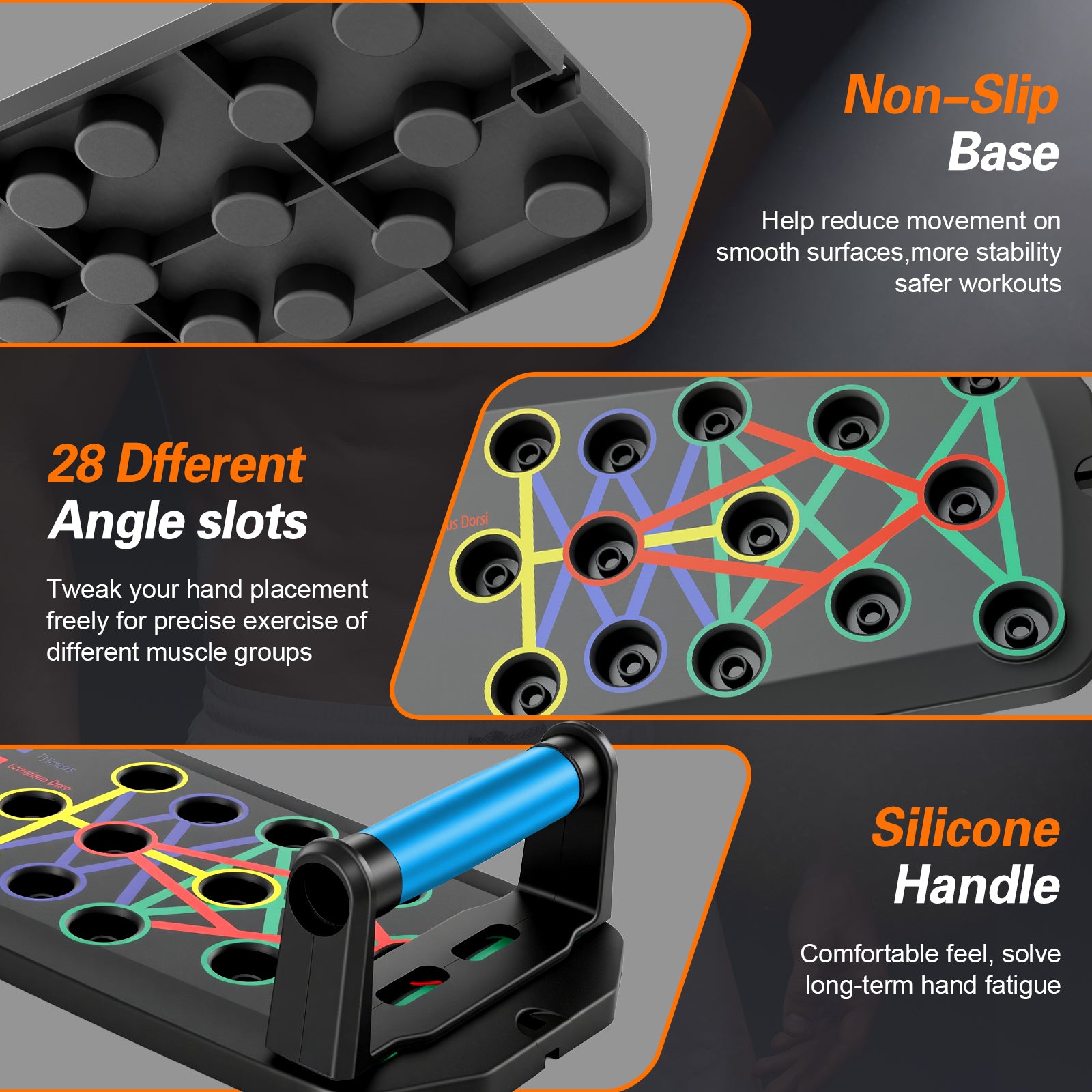 Say goodbye to boring push-ups and crowded gyms. This all-in-one push-up board is lightweight and foldable, ready to use right out of the box. Instantly transform your living room, balcony, or travel space into a workout zone. Ergonomic raised handles reduce wrist and shoulder strain, while 28 precision-engineered slots target your chest, biceps, shoulders, core, and back.