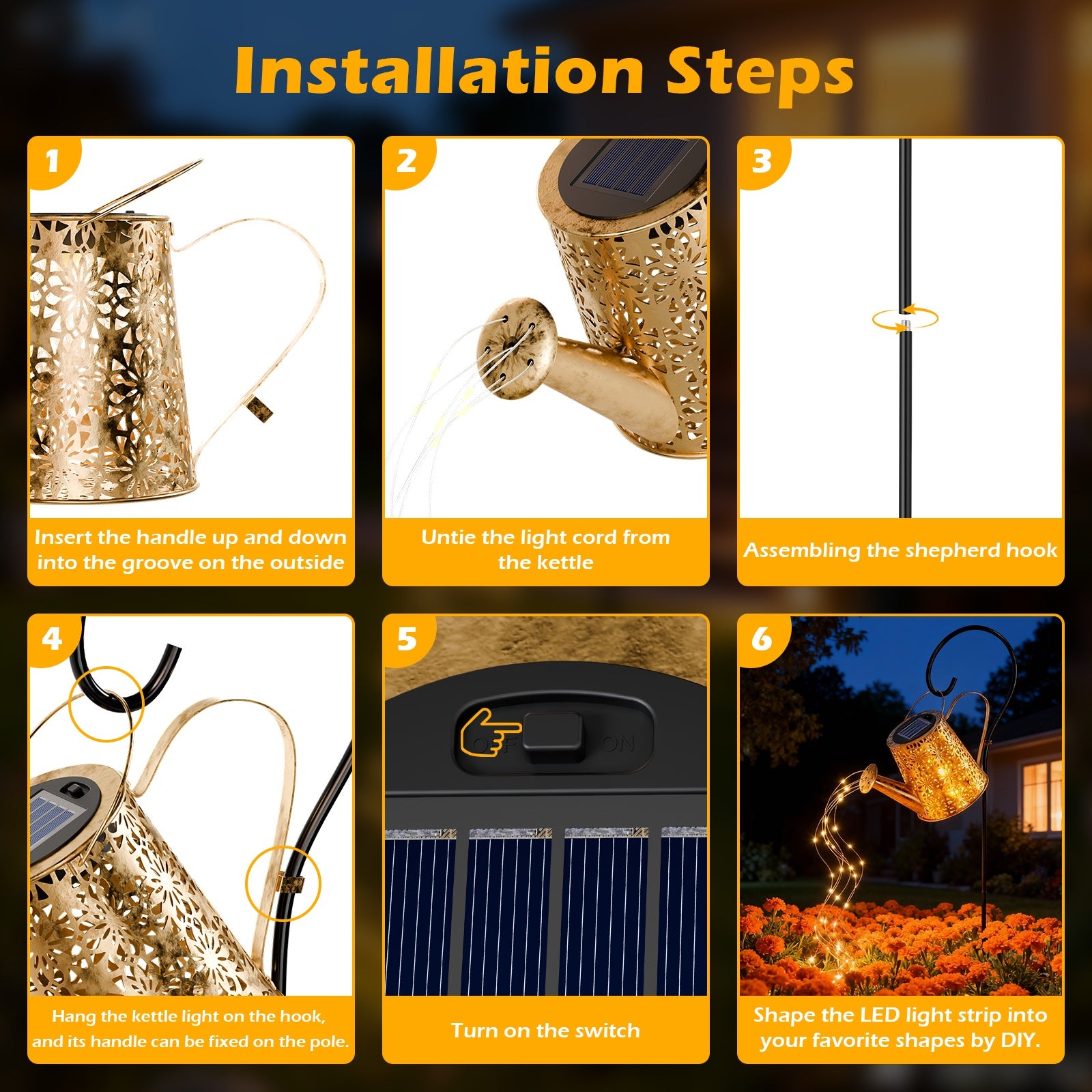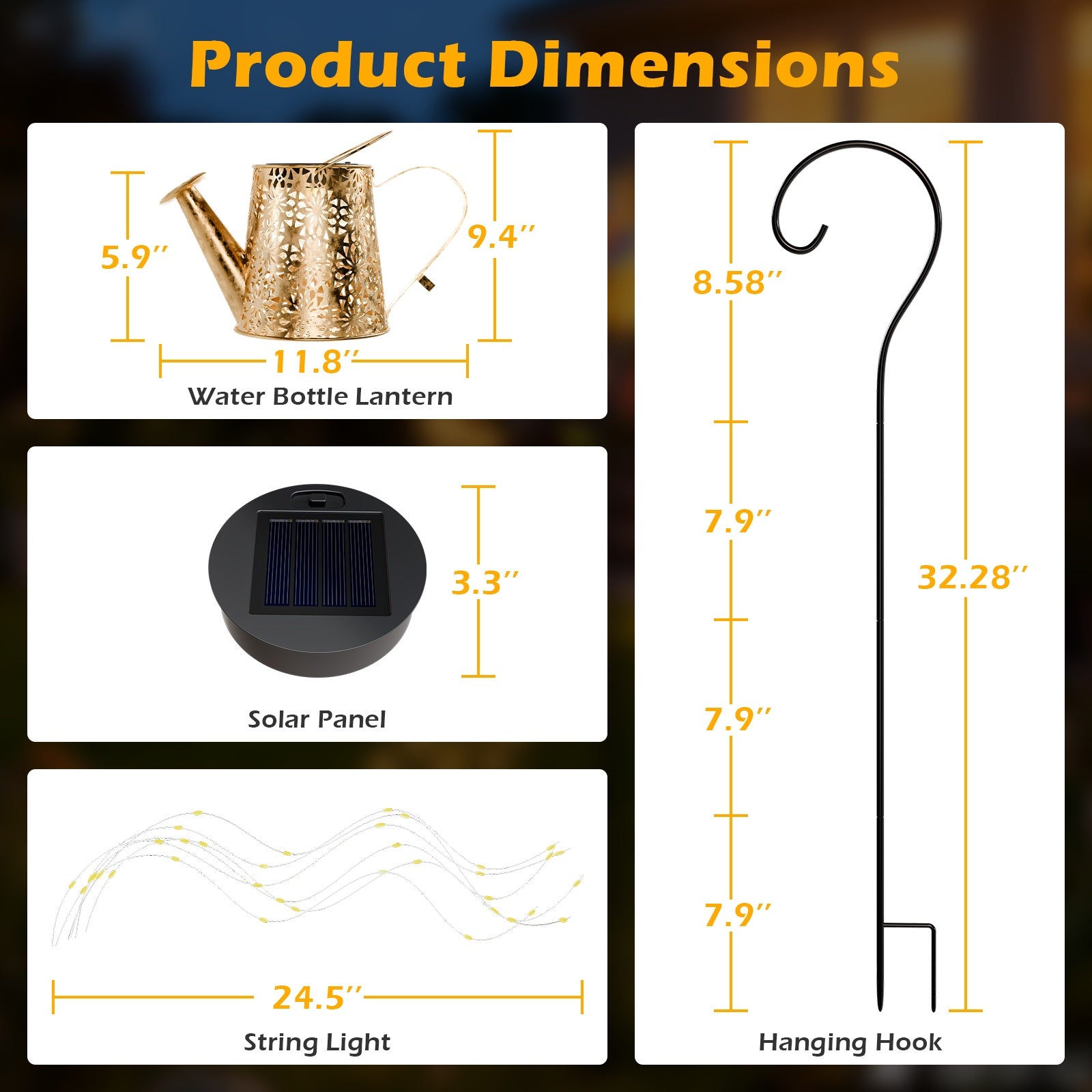 Solar watering can lantern, romantic garden lights, Brighten your outdoor space with the Solar Watering Can Lantern. The solar watering can lantern features a beautiful retro lace pattern that casts soft, warm light at night. Create a cozy atmosphere with the solar watering can Lantern.Place the solar watering can lantern on your porch, tree branches, patio table, or railing. The solar watering can Lantern is perfect for gardens, pathways, and entryways. Use the solar watering can lantern for daily decor or holiday events like christmas. Give the solar watering can lantern as a unique gift to parents, gardeners, or loved ones. Share warmth and emotion with the solar watering can lantern gentle glow.