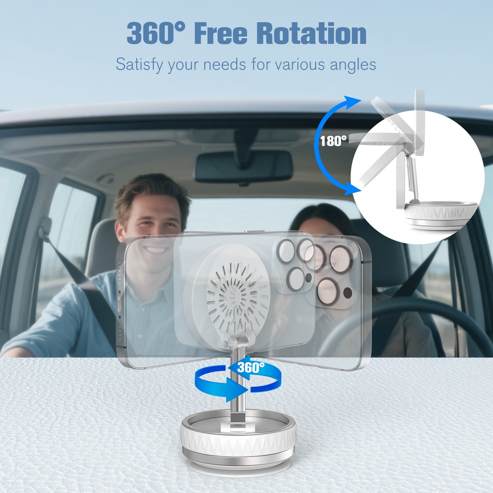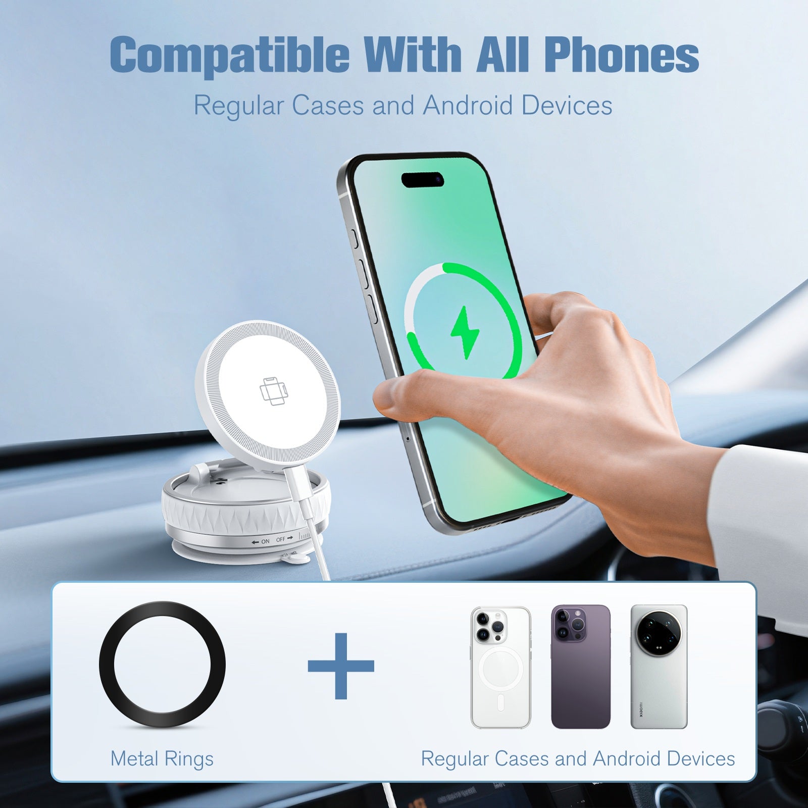 Car mount wireless charger for iPhone 16 15 14 13 12 series! Features 360¡ã rotation, 15W magnetic charging (starts when snapped on), secure magnetic hold and strong suction (steady in extreme temps). Lightweight, quick to set up¡ªgreat for commutes, rentals, road trips.
