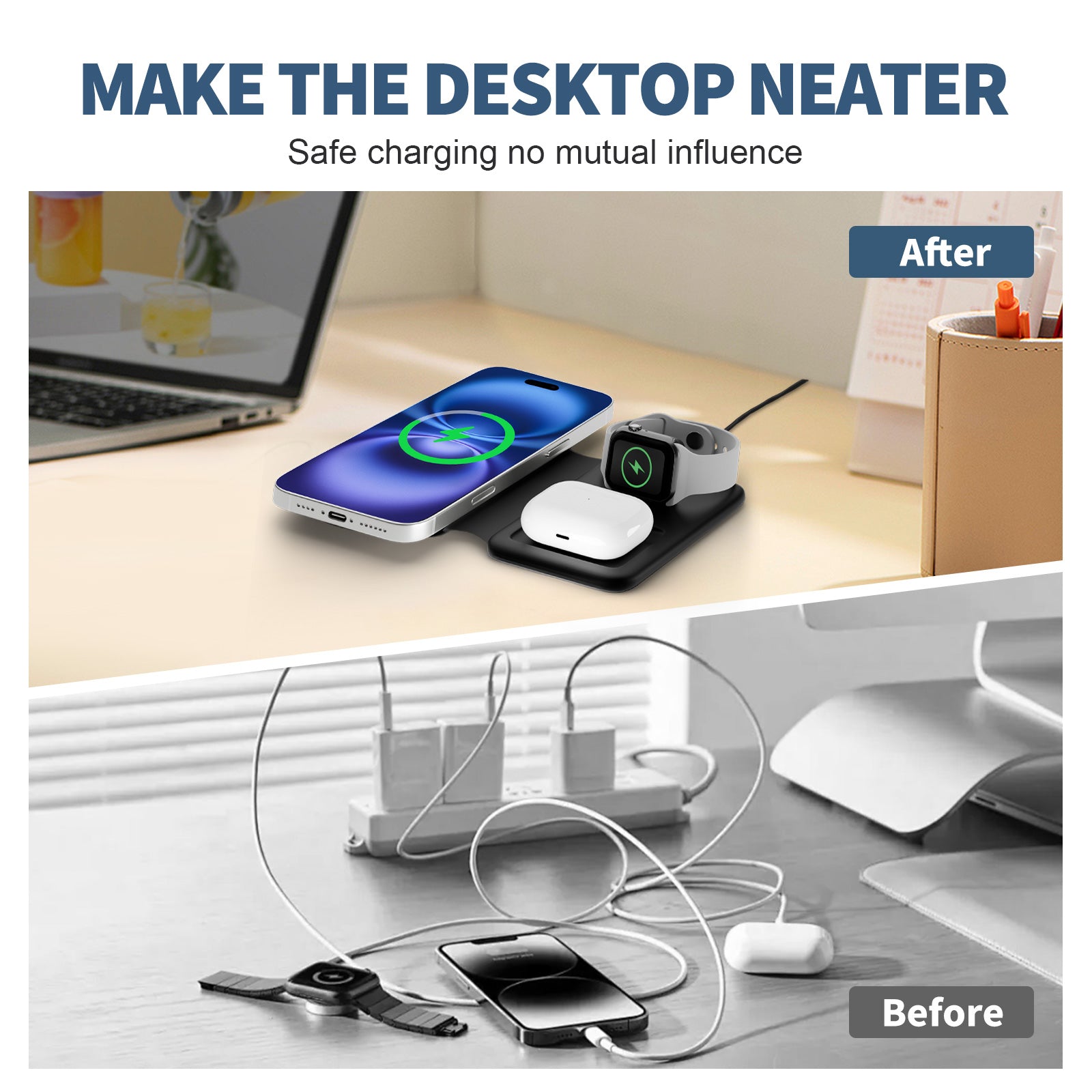 Tired of juggling chargers for your phone, earbuds, and watch? This magnetic wireless charger is here to simplify things. It¡¯s made with sturdy material that holds up to daily use. You¡¯ll love how it cuts down on cord chaos, keeping your desk or nightstand neat. Whether you¡¯re at home, in the office, or hitting the road, it¡¯s a breeze to take along¡ªjust fold it up and toss it in your bag. It works great with all kinds of devices, so you won¡¯t stress about compatibility. No more hunting for the right cable¡ªthis all-in-one charger has you covered, with fast charging and safety features to boot.