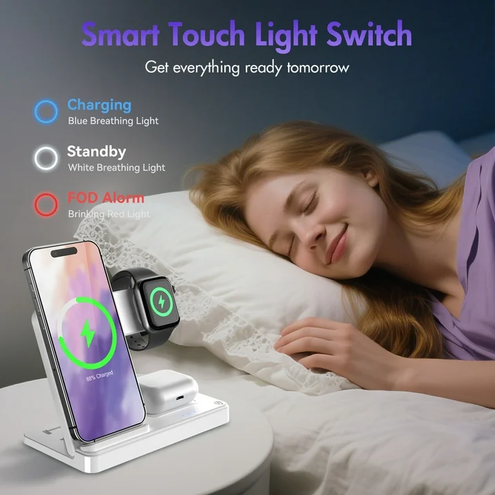 Stop the charging cable chaos and power up your entire Apple life effortlessly! Imagine your iPhone snapping perfectly into place with strong magnets for fast 15W charging while your Apple Watch rests securely on its dock and your AirPods juice up beside them¡ªall on one sleek, space-saving stand. No more hunting for cables or outlets; transform your bedside table or desk into a clutter-free charging hub that looks great and works smarter. Enjoy the freedom to use your perfectly aligned iPhone as a nightstand clock, video call station, or entertainment center while it charges. Built with quality materials, intelligent temperature control, and multiple safety features for complete peace of mind, this versatile charger is the ultimate upgrade to simplify your daily routine and keep all your essential Apple devices ready when you are¡ªexperience the ultimate convenience and order today!