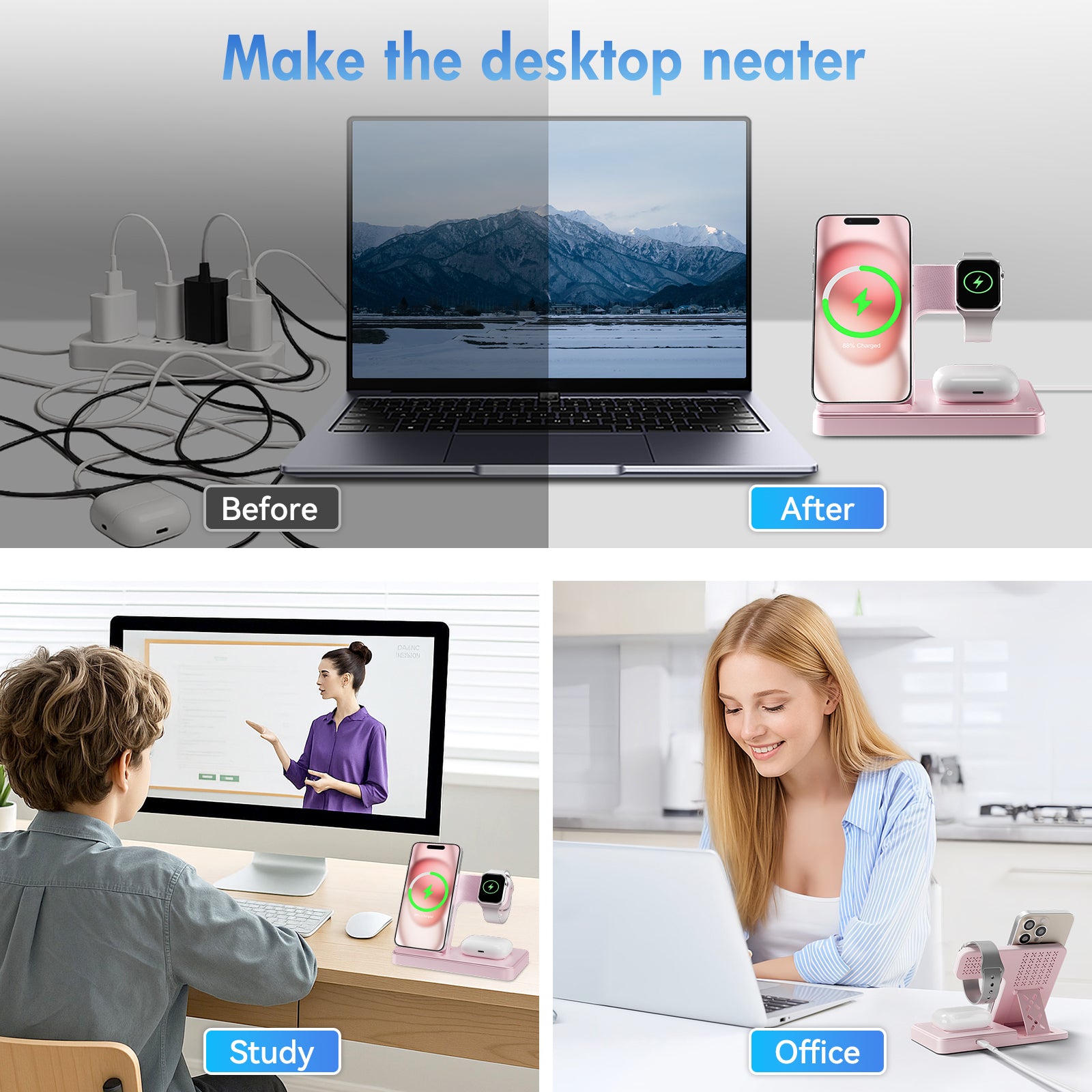 Stop the charging cable chaos and power up your entire Apple life effortlessly! Imagine your iPhone snapping perfectly into place with strong magnets for fast 15W charging while your Apple Watch rests securely on its dock and your AirPods juice up beside them¡ªall on one sleek, space-saving stand. No more hunting for cables or outlets; transform your bedside table or desk into a clutter-free charging hub that looks great and works smarter. Enjoy the freedom to use your perfectly aligned iPhone as a nightstand clock, video call station, or entertainment center while it charges. Built with quality materials, intelligent temperature control, and multiple safety features for complete peace of mind, this versatile charger is the ultimate upgrade to simplify your daily routine and keep all your essential Apple devices ready when you are¡ªexperience the ultimate convenience and order today!