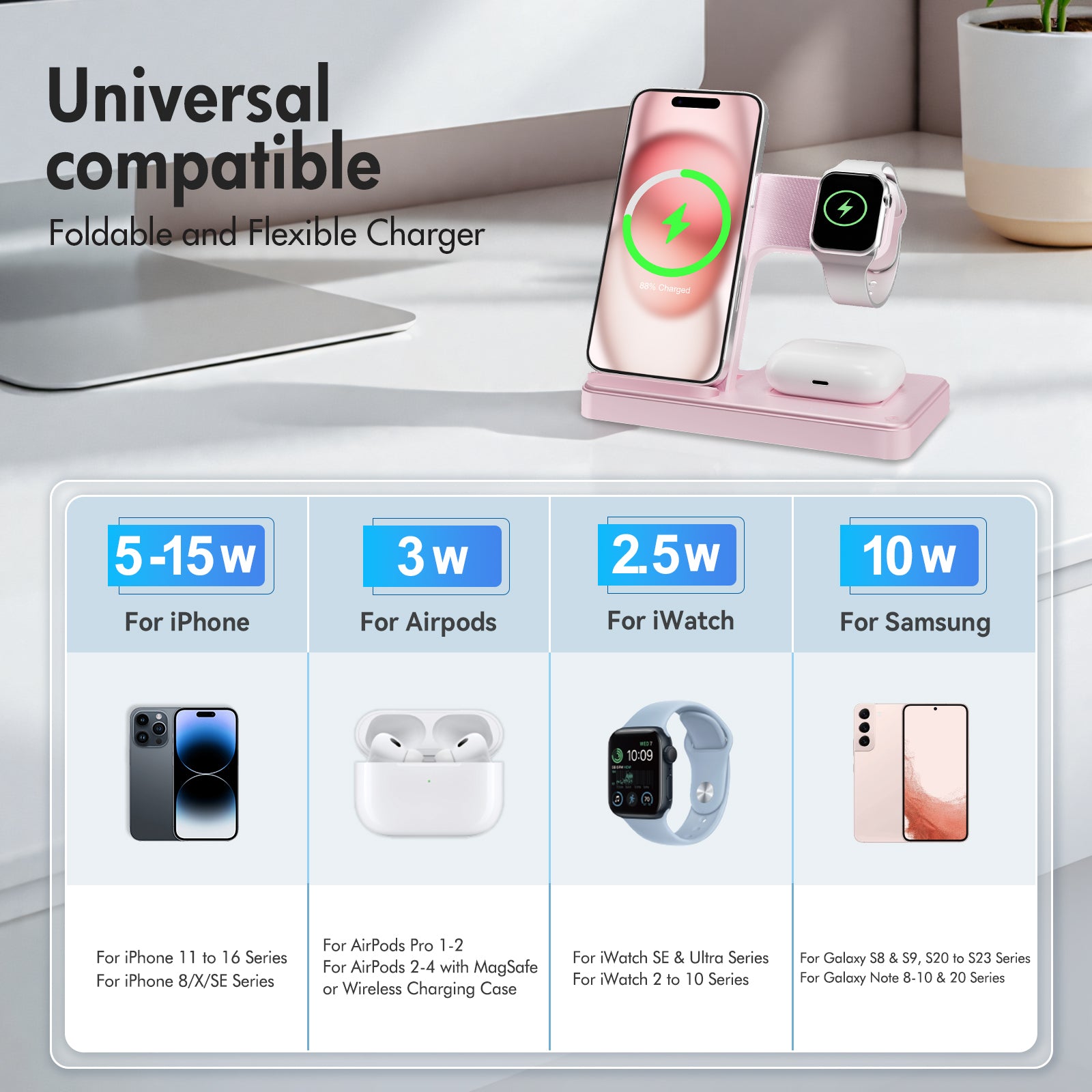 Wireless Charger, Magnetic Fast Charging Stand Compatible with iPhone 16 15 14 13 12 11 Pro Max Plus XS XR X 8, for Apple Watch 9 8 7 6 5 4 3 2 SE, for AirPods 3 2 Pro, 3 in 1 Charging Station, Pink
